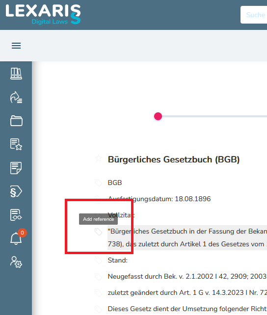 WICHTIG: Ihre Verweise werden von Lexaris gesondert abgelegt. Sie können auf alle Verweise, die Sie in verschiedenen Rechtstexten angebracht haben, gesammelt zugreifen, indem Sie in der Menüleiste links auf das Icon mit dem Paragrafenzeichen und dem Pfeilsymbol klicken